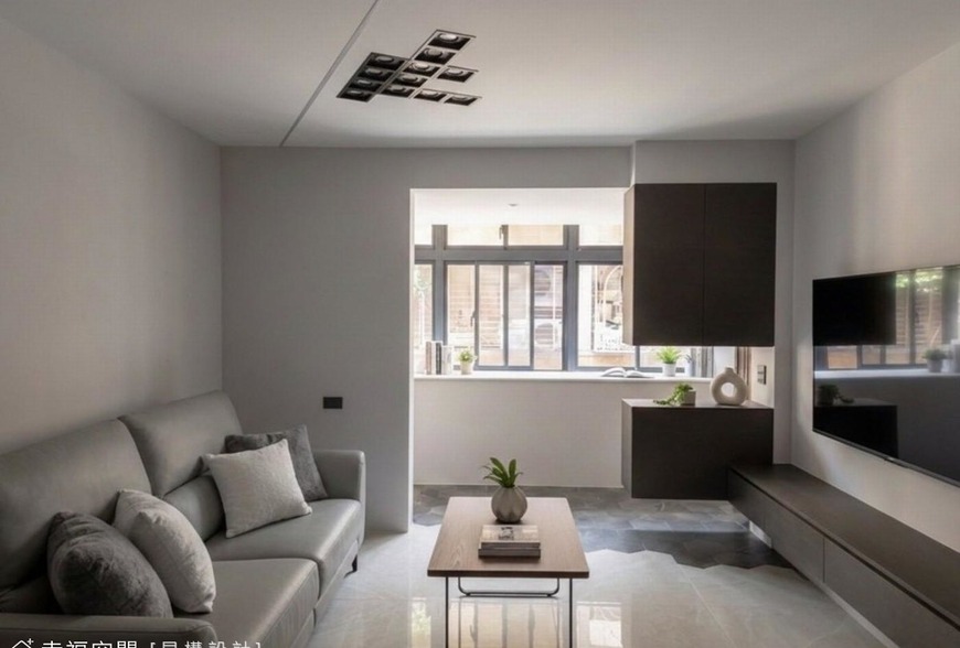 天花板的線性嵌燈與幾何格狀投射燈,不只是照明,更是空間的視覺引導,讓客廳充滿未來感。