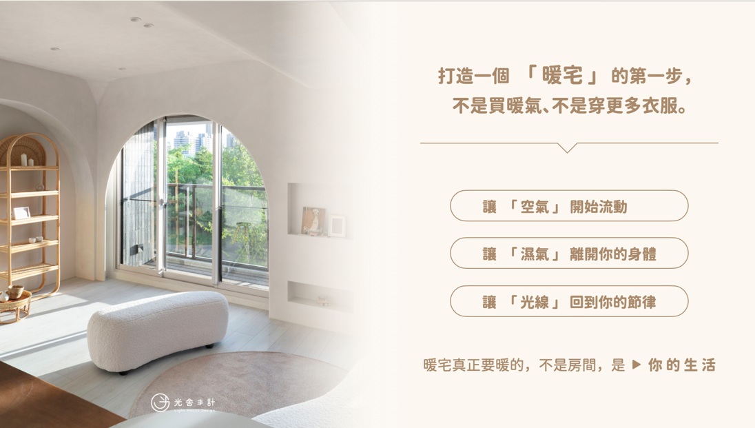 有時不是房子不好,而是我們都習慣了「將就」。光舍丰計周語華總監分享了一個概念,冬天不見得真的很冷,但有些房子,沒漏水、也沒東西壞掉,卻總是讓人渾身不對勁,有一種「不想待在家」的感覺,那是因為房子沒有被設計成會呼吸的狀態,試著把設計變成一種健康投資,透過「光、空氣、水與聲音」,把家調回貼近自己且最放鬆的頻率,呼吸更乾淨、光更柔和、能量更穩定,生活才會變得健康舒服。