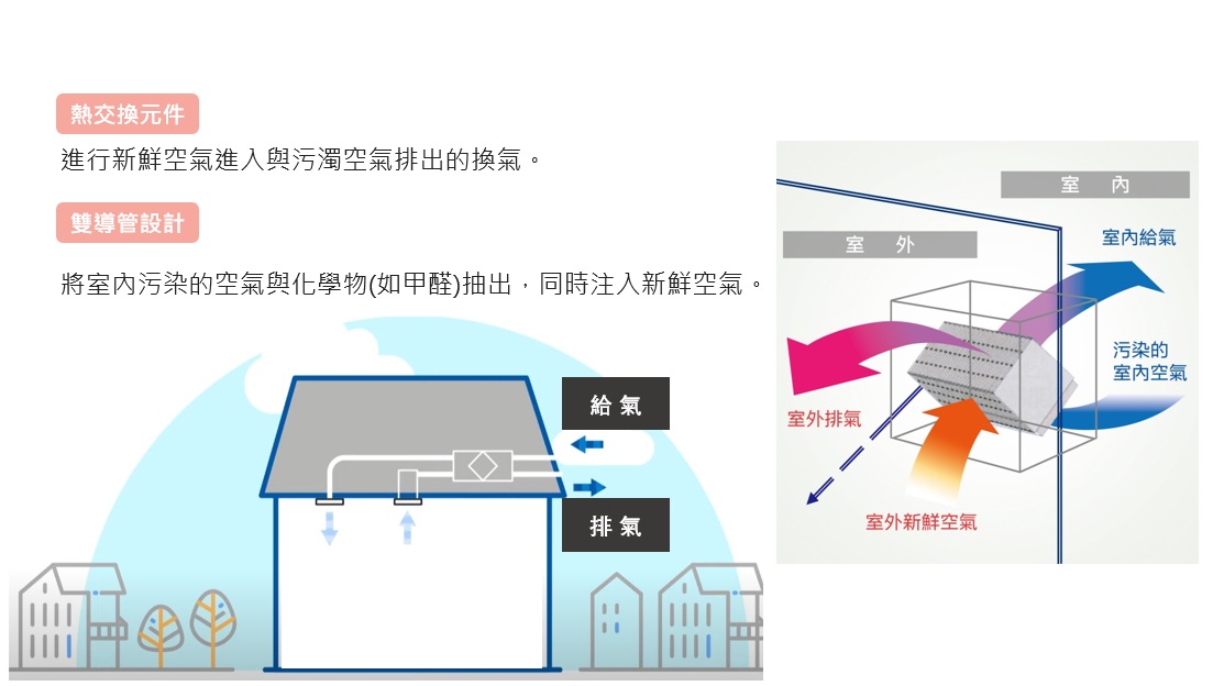 如何在不開窗的情況下,也能讓空氣活起來?這時候全熱交換器就是最佳的工具,透過全天候循環換氣,即使不開窗,室內空氣也能保持清新。在房子的外牆預留進氣孔和排氣孔,讓新鮮空氣進來、汙濁空氣排出去。同時,外面和裡面的空氣會在濾芯裡做熱能交換,達到溫度平衡。