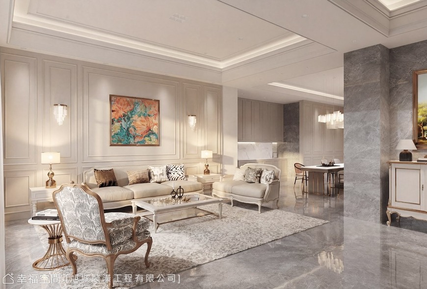 地坪選用高拋光石材,映射空間光影與家具輪廓,強化場域的延展性與尊貴質感。牆面則以線板比例搭配淺色調處理,平衡石材的厚重,使整體空間在華麗中保有溫度與居住感。