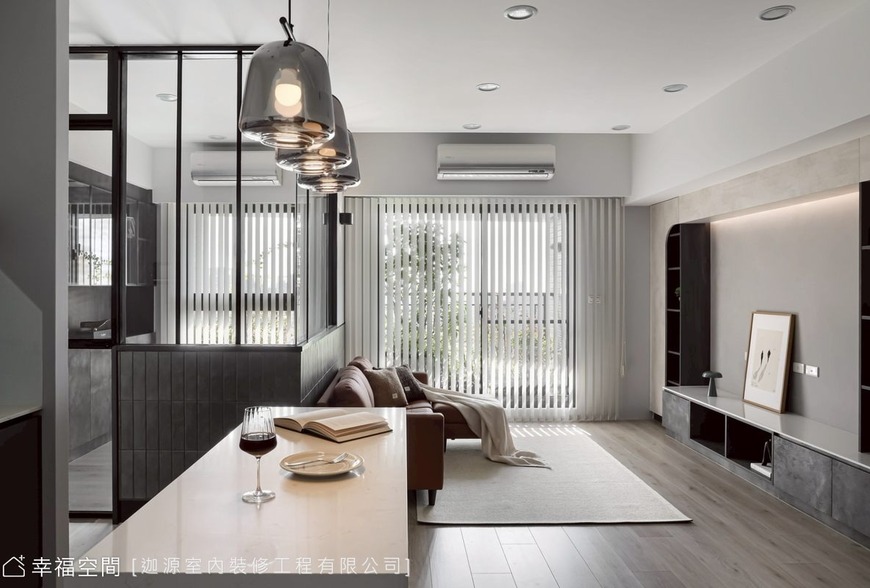 電視牆設計,以深色木紋包裹櫃體,維持立面的一致性,以及極致收納的視覺延伸。書房則採用半高玻璃隔間取代實牆,讓光線穿透深色調的客廳,消弭壓迫感。