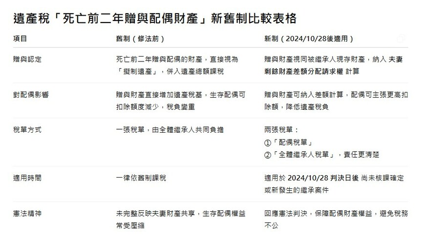 新制有三大重點。首先,適用時間點從2024年10月28日起算,只要是當日後發生繼承、或尚未核課確定的案件,都適用新規。其次,繳稅方式將更透明,國稅局會開立兩張繳款書,一張針對配偶,一張針對全體繼承人,分別計算稅負比例,讓責任歸屬更為清楚。最後,也是最關鍵的部分,死亡前二年贈與配偶的財產,將被視為被繼承人現存財產,納入夫妻剩餘財產差額計算,讓配偶能獲得應有的扣除保障。