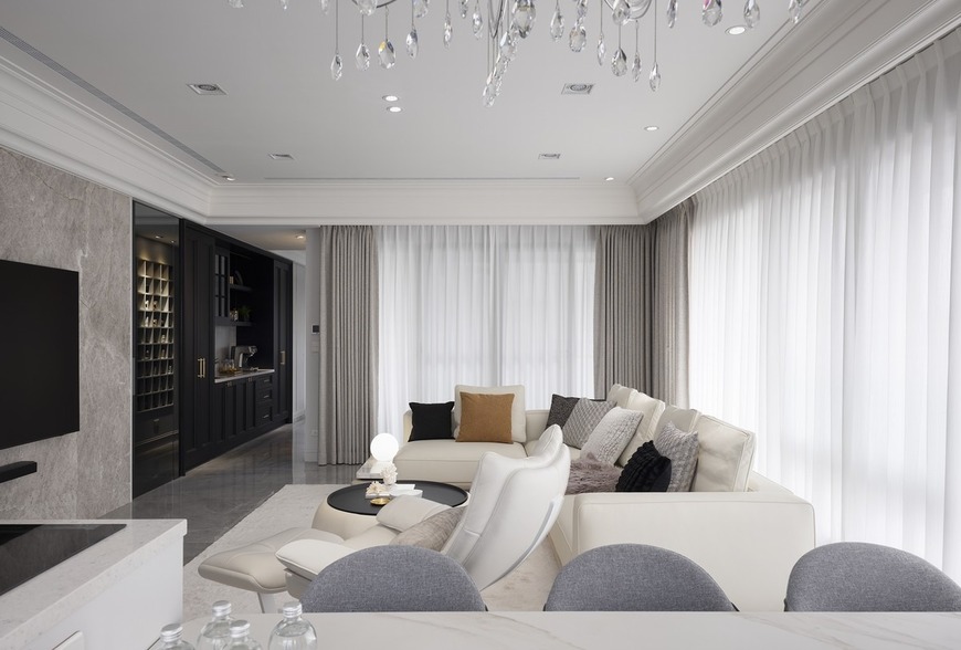 全室配色以黑白灰作為基底,以及原結構的多面落地窗景,使我們決定規劃光透感的玻璃、鏡面材質做出空間層次,例如玄關的鐵件玻璃門、臥房的不沾手灰玻隱藏門,劃分隱私卻仍穿梭無礙。臥房則透過不同窗飾調整空間光感與比例,讓每位家人的專屬主題房:可愛森林家族、浪漫愛麗絲、摩登蠟筆小新、低調法式,因為光線而變得更加迷人。