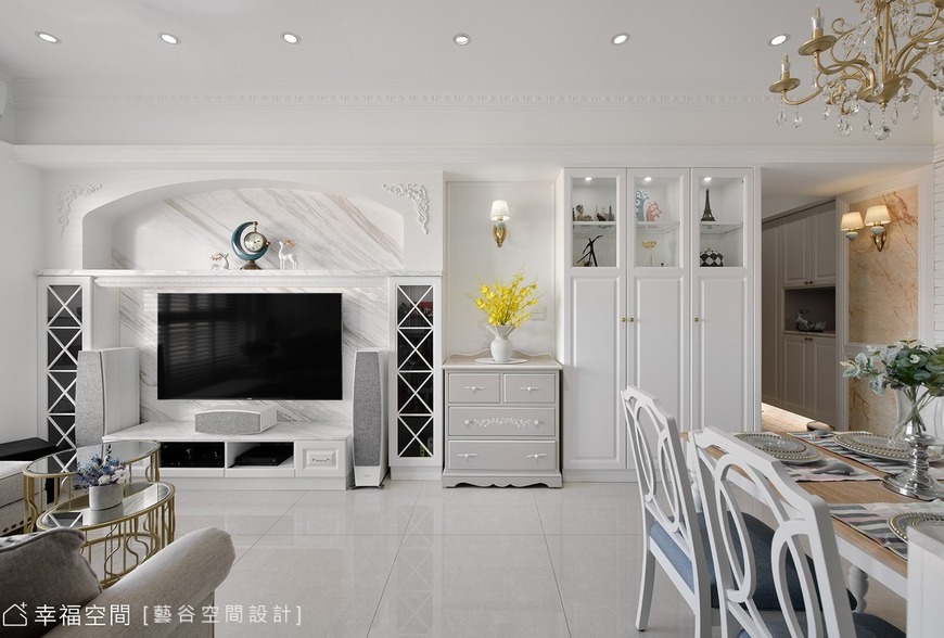 25坪居宅微調主臥與客廳牆體,拓寬收納並流暢生活動線。餐廳巧妙以隱形門化解對衛浴風水,並增設窄型吧檯中島與廚房座位,延展坪效。揉合木作、系統櫃與石材,搭襯細緻拼花磚,築起機能與浪漫並蓄的典雅端景。