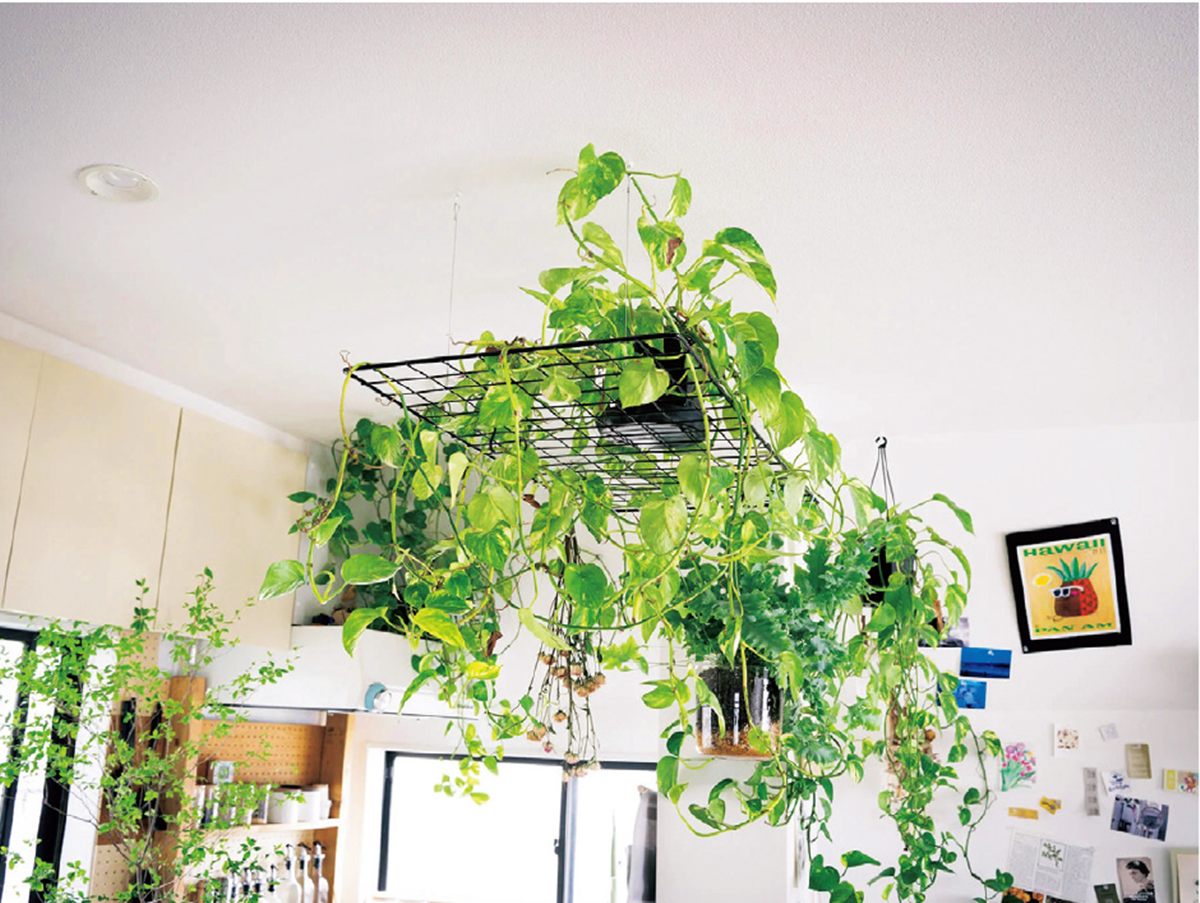 ▲在天花板安裝格子架、提供黃金葛攀爬,是一個富有創意的點子。對於黃金葛這類具攀爬性或蔓生性的觀葉植物,只要在其附近設置可供纏繞的結構,它們就會順著延伸生長,呈現出蔓延的綠意姿態。