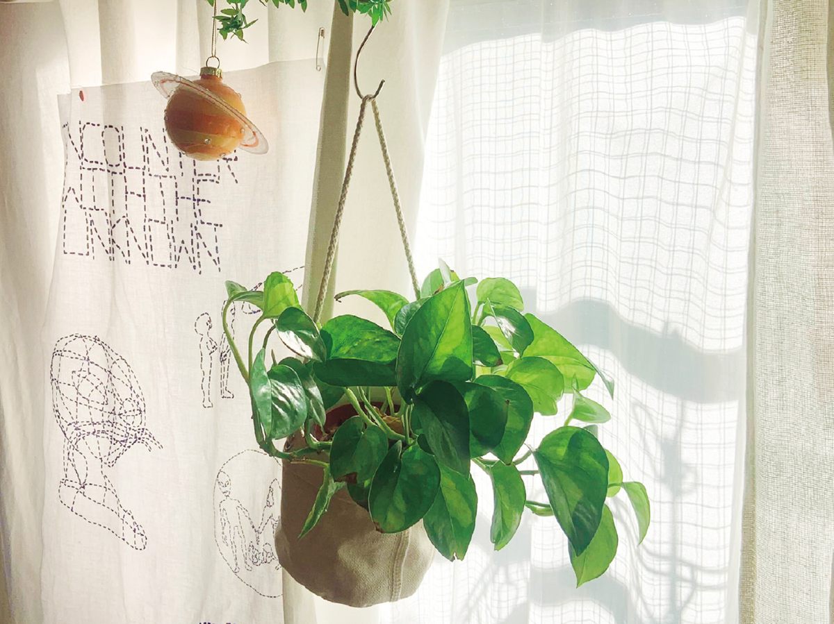 ▲隔著蕾絲窗簾懸吊窗邊的世界綠黃金葛,使用小盆栽尺寸就不會過重,可直接利用窗簾桿懸掛。
