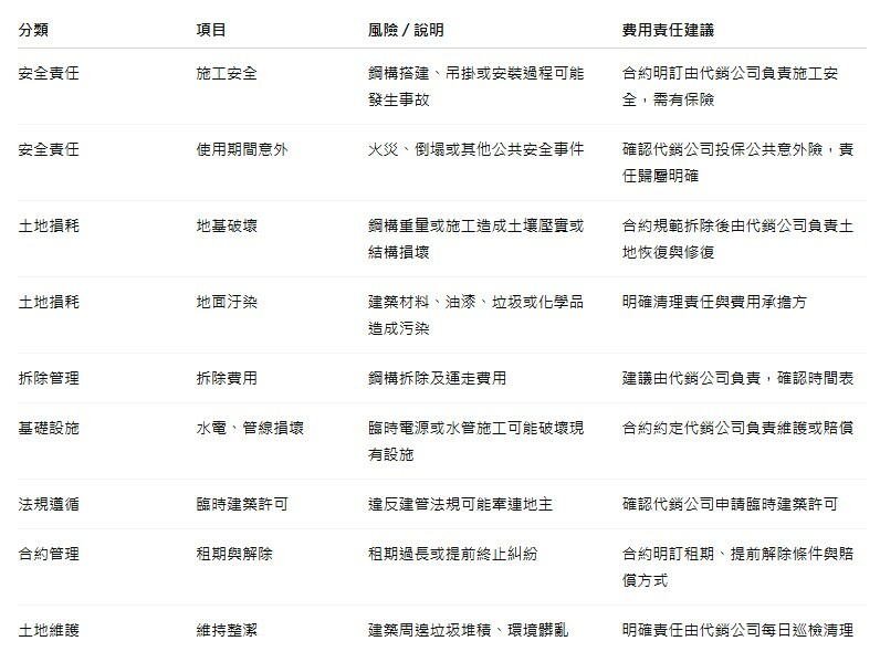 鋼構建築在施工及使用期間可能存在意外風險,例如倒塌、火災或公共安全事故。若代銷中心出現事故,地主若未在合約中明確規範責任歸屬,可能承擔部分法律責任或賠償壓力。專家建議,地主必須確認代銷公司有完備的保險與施工安全措施,並在合約中明訂風險責任分界。