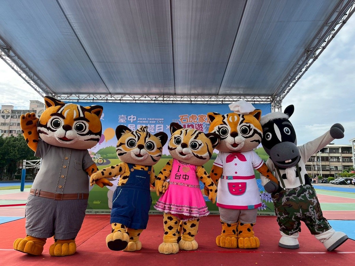 ▲ 全市唯一「石虎家族與歐米馬」5隻吉祥物全員出動,現身大甲區市民野餐日場次。(圖/中市新聞局提供 記者游穎達台中傳真)