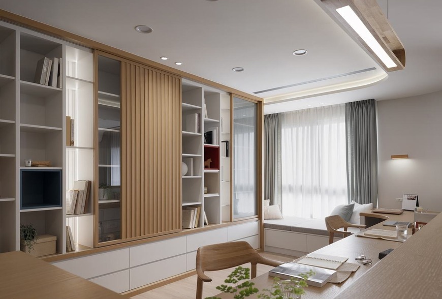 開放式公區以溫潤木質為沉澱的主軸,淺木色地板基底,壁面與門片搭配格柵與木皮板。開放式格局帶來寬敞視覺卻也影響隱私問題,原始格局從玄關就能一眼穿透進臥室,所以我們在開放裡保留界線,例如玄關的日式造型屏風、書房的半腰L牆,既遮蔽桌面與書牆收納,也讓角落臥榻多點安全感,保留生活的層次。