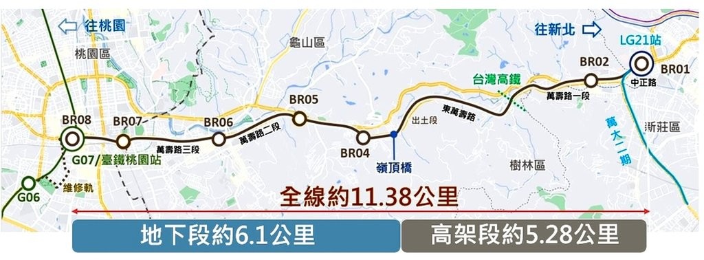 捷工局說明,BR01站可與萬大線LG21站共構並轉乘新莊線迴龍站,透過調整橫渡線道岔,班距可縮短約30秒;BR02站設有連通道,提供學生安全通行,減少私人運具使用。BR03站經設計優化避免拆除大棟橋,保留未來改設彈性;BR08站則規劃地下連通道進入台鐵桃園站,以交通安全為首要考量。
