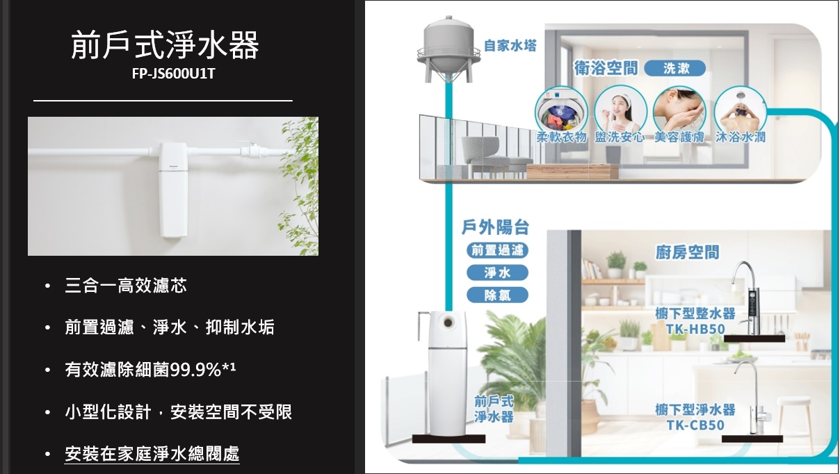 以Panasonic前戶淨水設備來說,它不僅體積輕巧,,適合多種家庭環境。能裝設於總水源開關旁、透天水塔後,在自來水進入家中前就攔截水中泥沙、鐵鏽及微小雜質,保護家中管路暢通,待過濾乾淨後才送至房屋各處使用,防止管路累積沉積物,降低阻塞風險,亦確保洗澡、烹飪、洗衣等用水都是潔淨、安全的。搭配三合一高效濾芯,可有效過濾雜質、淨化水質、抑制水垢。