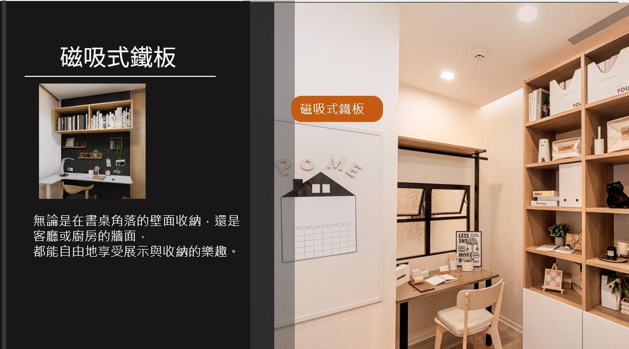 Panasonic的磁吸式鐵板,外觀像木質裝飾板,內部加入金屬薄板的特殊牆材,能完美融入各種居家風格,無論是在玄關、書桌角落的壁面收納,還是客廳或廚房的牆面,都能自由作展示與收納之用,但不適合放在浴室、戶外或靠近火源的地方。