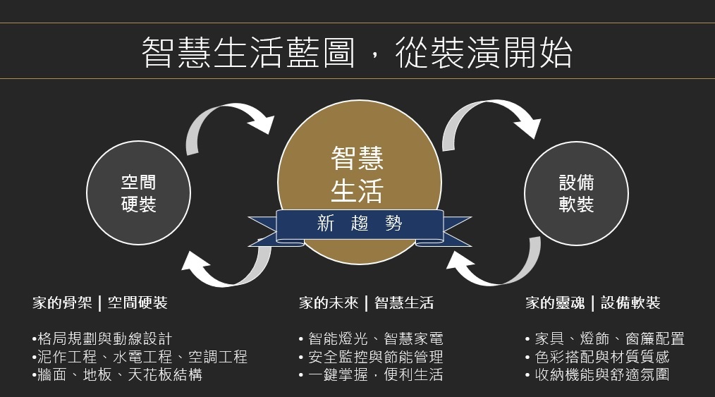方人凱總監提到,智慧生活的藍圖從裝潢開始,一站式整合讓一切變得輕鬆、提升日常效率,由空氣、水、光三大重點切入,運用科技智能,透過智能燈光、智慧家電,做好安全監控與節能管理,一鍵即能掌握便利且舒適的生活。