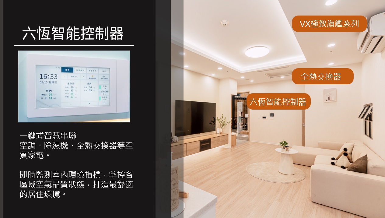 若居家條件許可,可在客廳空間導入六恆智慧控制器,維持室內環境保持恆溫、恆濕、恆氧、恆靜、恆潔、恆智,搭配空調、全熱交換機、除濕機等設備,自動調節室內溫度與濕度,也能偵測二氧化碳與 PM2.5,自動啟動新風或空氣淨化,維持乾淨又含氧量足夠的空氣。整合IAQ空氣品質管理系統,並連動IoT智慧家電,讓全家人在乾淨、舒適的空氣環境中自在生活。