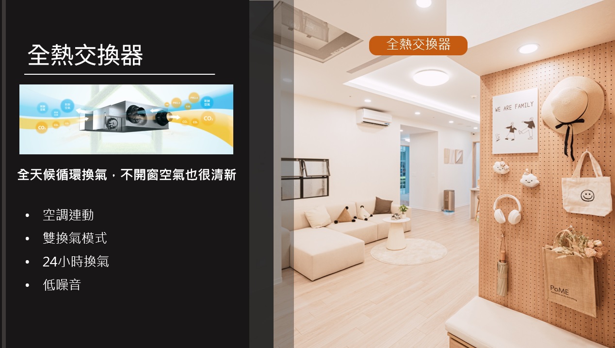 針對害怕空氣汙染的住戶,例如住在高速公路、高架橋或主要道路旁,或長時間開空調,不習慣開窗的人。或是對甲醛、黴菌、塵螨等過敏,易呼吸道感染的人,還是因通風不良、二氧化碳濃度容易過高的空間, 方人凱總監建議可以使用全熱交換器,全天候循環換氣,即使不開窗,室內空氣也能保持清新。