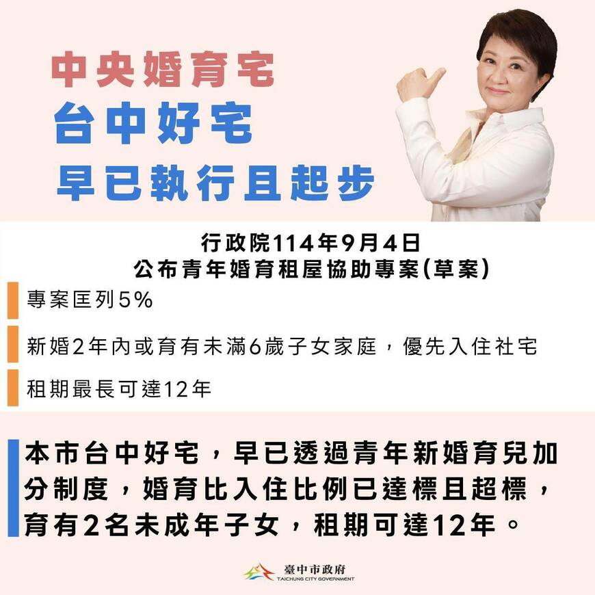 台中市政府表示,這些加碼措施展現政策核心精神,以家庭為中心、以青年為優先、以育兒為導向。透過整合教育、托育與社福資源,打造全方位的婚育支持網絡,不僅滿足青年與育兒家庭的居住需求,也讓台中在六都中成為最友善育兒城市之一。