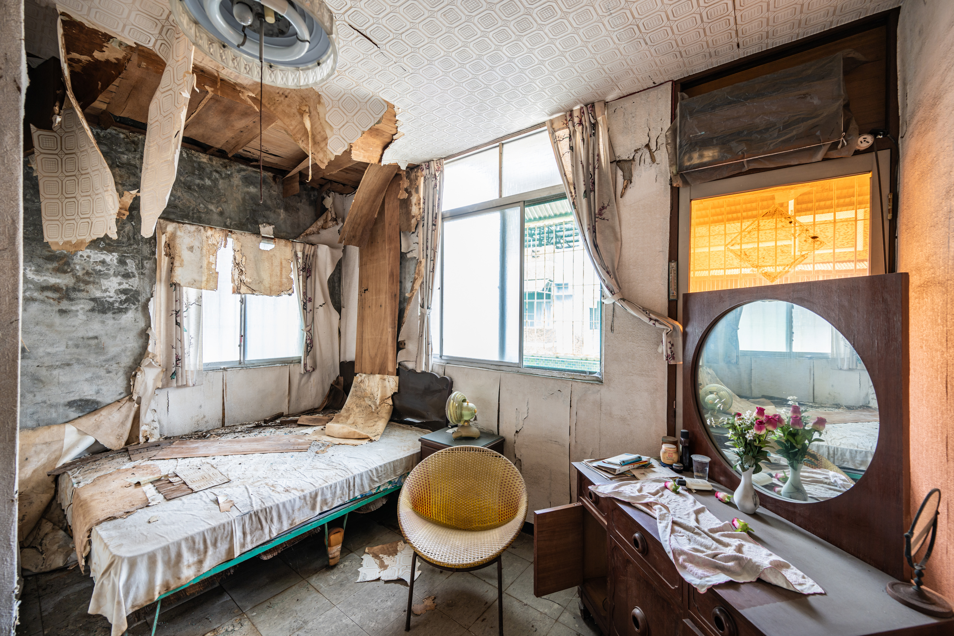 壁癌、漏水、白蟻、鋼筋外露,甚至電箱還是五〇年代的那種,打開時還會冒火花。