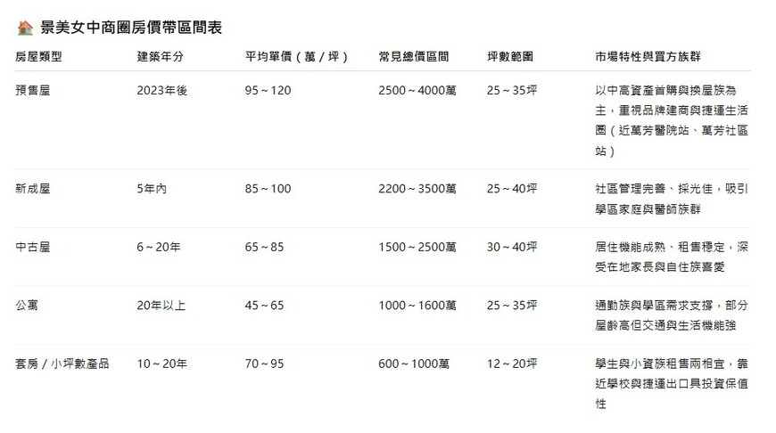 整體而言,景美女中商圈兼具文教氣息與自然環境,區內房價穩健、交易穩定,是台北市難得保有生活溫度的住宅區域。房市專家分析,隨著新店與木柵建設發展帶動區域串聯,景美女中商圈有望成為北市自住族新寵,「當其他地區忙著追漲,這裡用時間證明價值。」