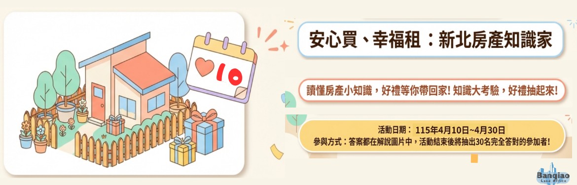 【新北市訊】新北市板橋地政事務所自115年4月10日起至4月30日止,於該所網站舉辦「安心買、幸福租:新北房產知識家」有獎徵答活動,只要全部答對並填妥個人資料,即可參加好禮抽獎,活動結束後將抽出30名幸運兒,歡迎大家一同拿滿分、抽好禮!