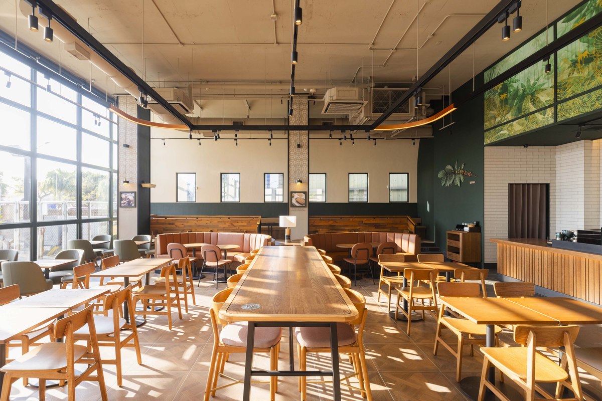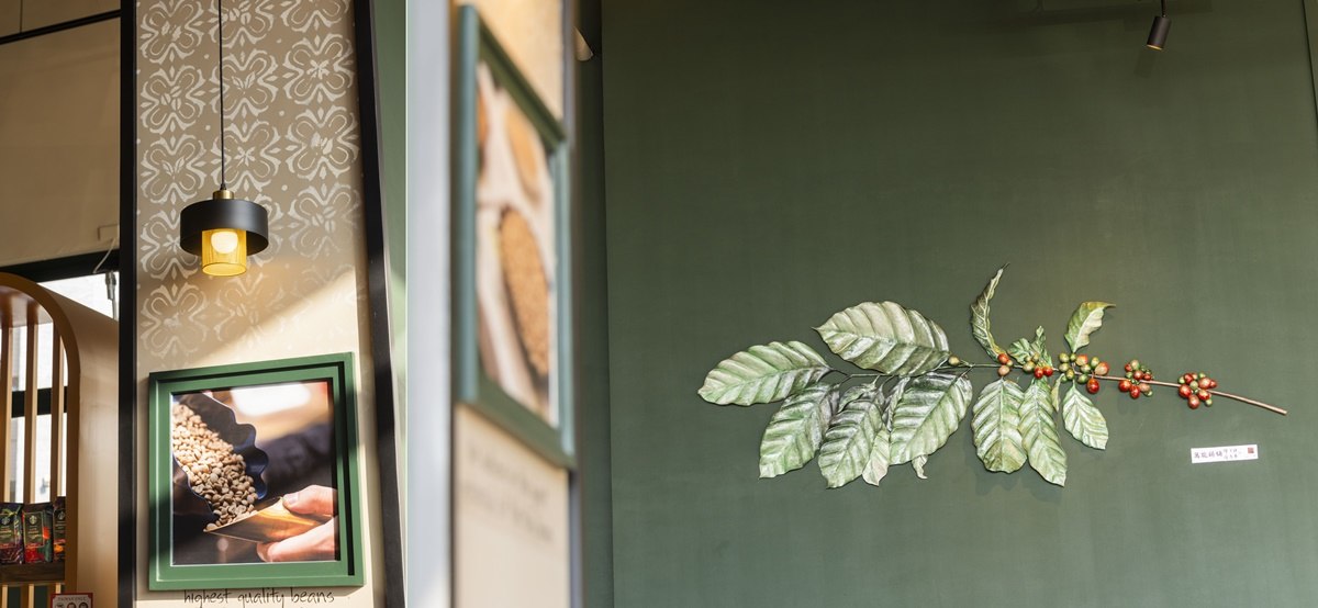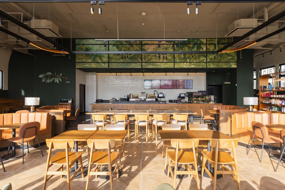 整體空間以「咖啡吧檯」為視覺與動線的中心,延伸至兩側客席採用靠背沙發配置,讓顧客的視線自然匯聚於店內的焦點中心。中央座位亦以獨特造型沙發點綴,兼具設計感與機能性,滿足多人聚會的需求。天花延續原有的挑高與開闊視覺,讓整體空間更顯寬敞舒適,外觀則以漸層綠點綴,勾勒出建築與周遭環境的和諧氛圍,營造彷彿置身綠意之中的自然意象。夜間輔以水紋燈投射,波光粼粼的光影在外牆上流動,讓顧客彷彿置身悠閒自在的自然場域,享受放鬆而沉浸的咖啡時光。
