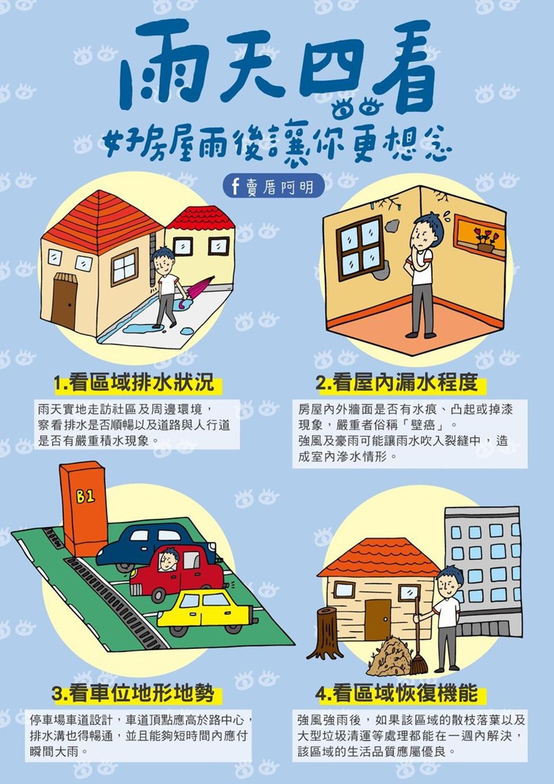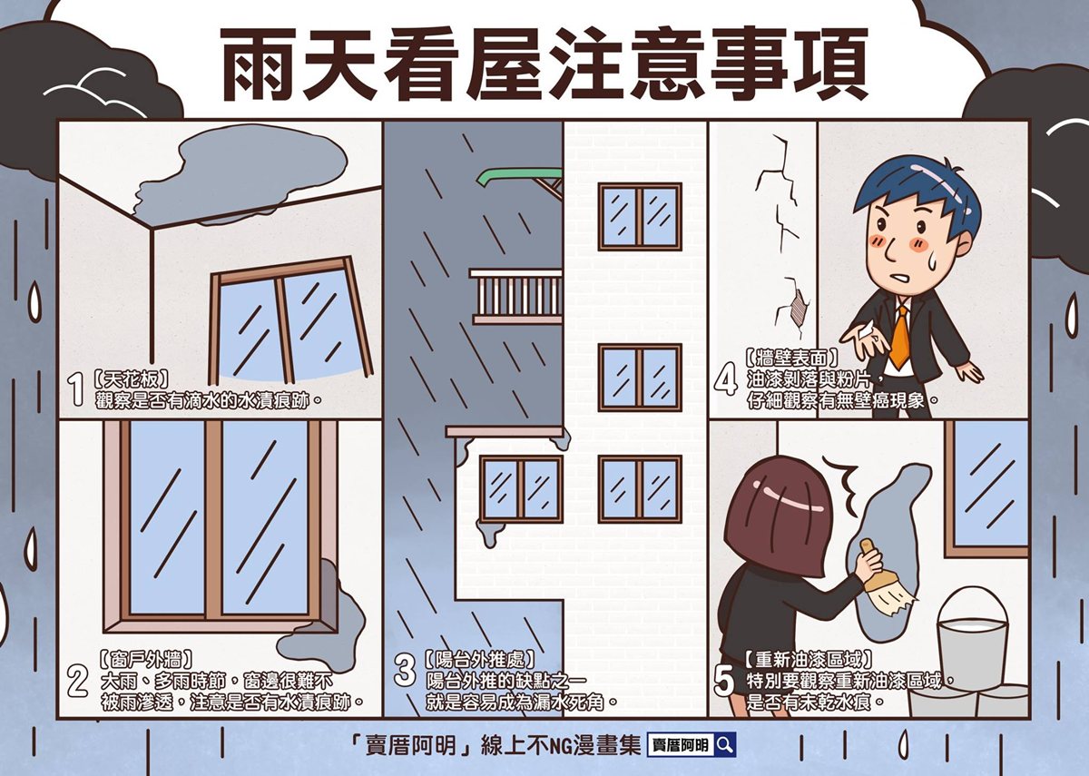 有句話說的好:「不看晴天看雨天」大部份的民眾都不太喜歡溼答答的天氣,所以陰雨天看屋的人數通常極為稀少。但房產知識達人賣厝阿明認為下雨天是看房好日子。重點是下雨天看房您才能確認您喜歡的房子到底會不會漏水。相信很多朋友都會想知道,房子裡面看得見,房子外面要怎麼看呢?以下幫大家彙整雨天看房攻略,讓買房小白買得開心,住得安心!!