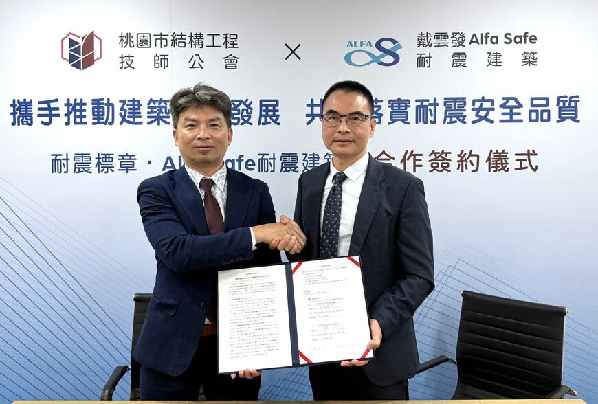 為促進建築施工品質提升與耐震技術交流,桃園市結構工程技師公會今(9)日與 Alfa Safe 耐震系統工法團隊舉辦合作交流儀式,雙方將就施工品質管理、技術教育訓練及實務經驗分享等面向展開合作,期望透過專業交流機制,強化建築工程於施工階段之品質落實。