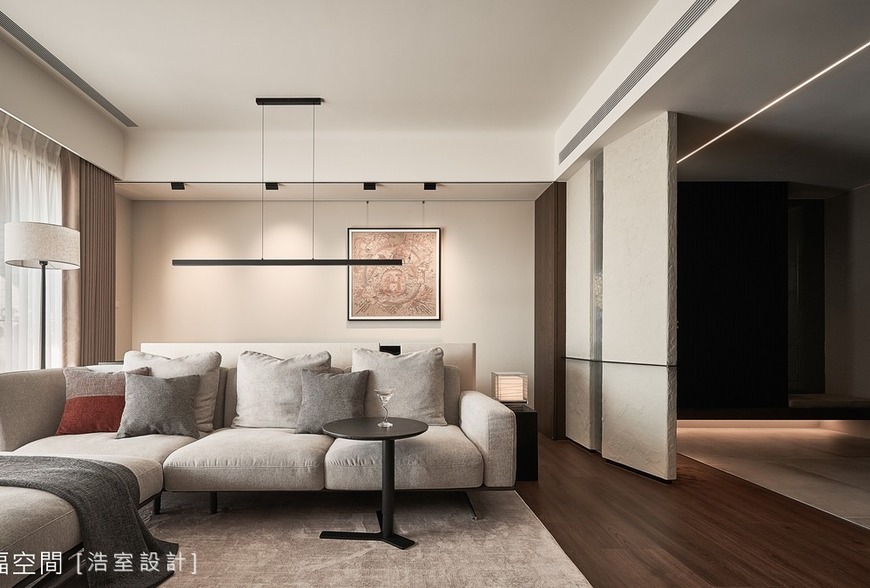 電視主牆採特殊塗料的多層手工疊塑,精準線條比例分割,木質檯面在擬真暖光映照,呈現安定而溫潤的立面風景。沙發後方規畫閱讀區,以半高塗料牆界定,營造沉思與充電的靜謐角落,呼應居者專注的職業特性。