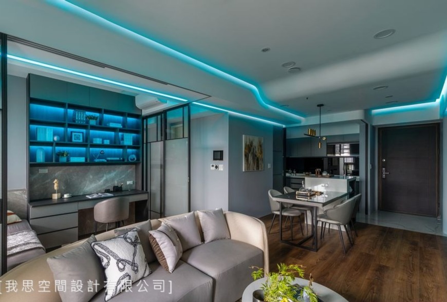 客變時拆改多餘房間,滿足屋主需兩房的需求,並將其中一房改為可兼作客房的開放式書房。設計團隊對空間格局調整、材質搭配以及燈光變化的巧思,呈現出極具科技感的家居氛圍,同時兼顧功能性與美學。灰階色系的空間,運用變色燈帶提升空間層次,輔以玻璃拉門在書房與廚房之間保留彈性界線,讓生活在開放與獨立之間自由切換,更反映屋主對設計的信任與對未來居住體驗的期待。