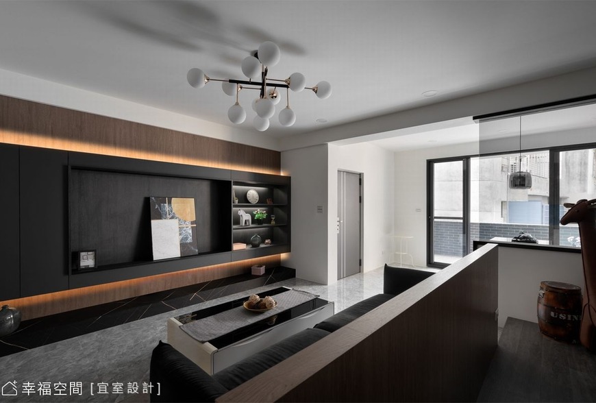 • 黑框展示櫃+內嵌燈帶形成客廳主視覺;下方做「懸浮感」踢腳照明。