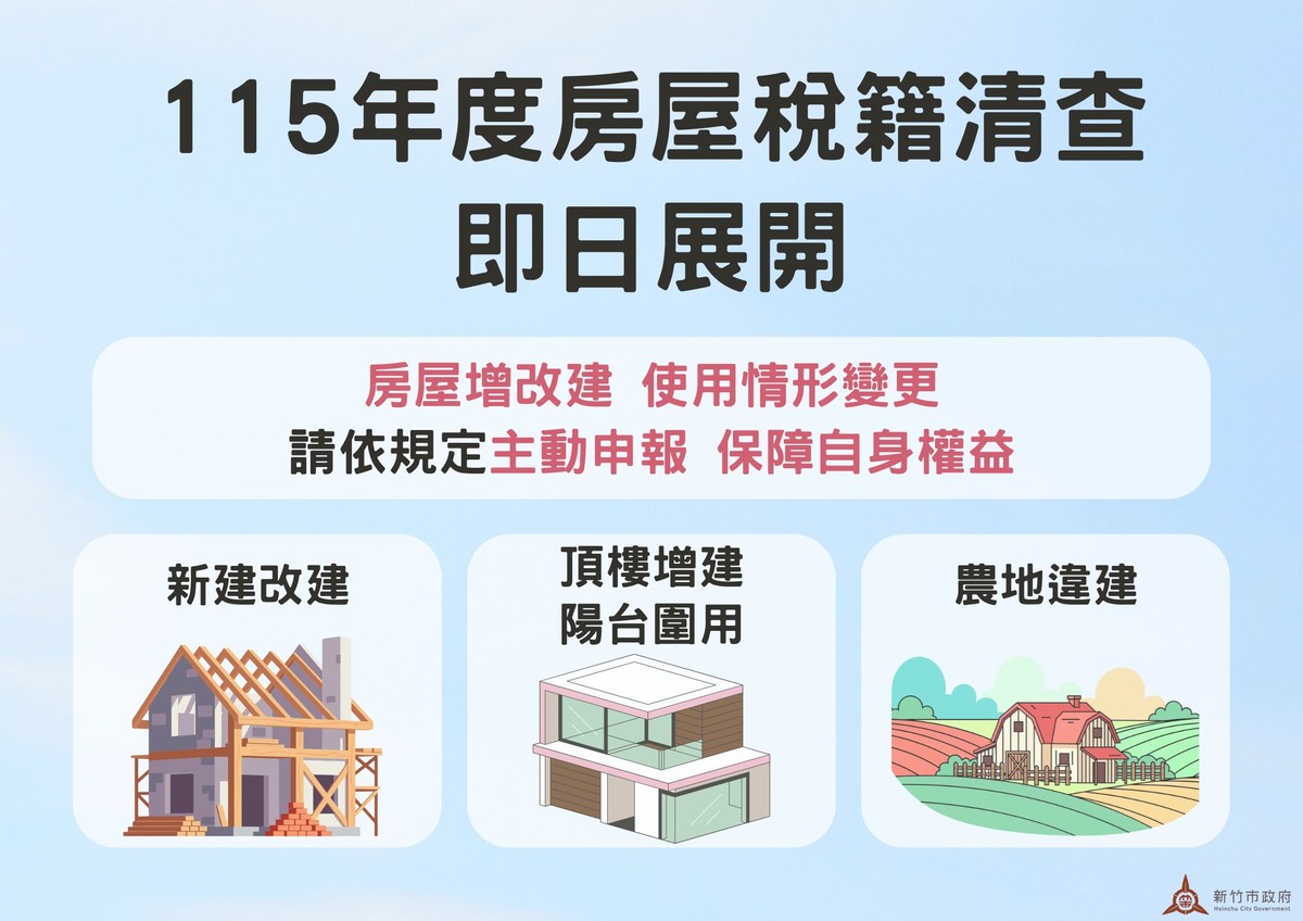 為維護租稅公平並健全房屋稅籍,新竹市稅務局自即日起至11月30日止,展開115年度房屋稅籍清查作業,針對房屋新建、增建、改建及使用情形變更等進行全面查核。稅務局提醒,房屋稅籍登載是否正確,攸關每位屋主的納稅權益,因此房屋若有增改建或使用情形變動,務必依規定主動申報,以保障自身權益。