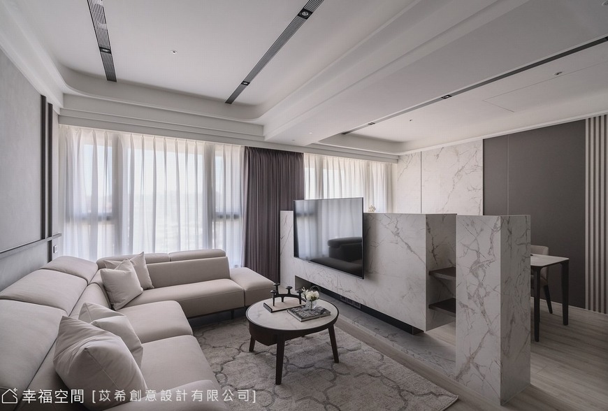 公共空間的設計是這個案子的靈魂。我們打破了傳統的電視牆設計,採用了中島式的石紋大板磚作為客廳與餐廳/中島之間的半開放式隔斷。