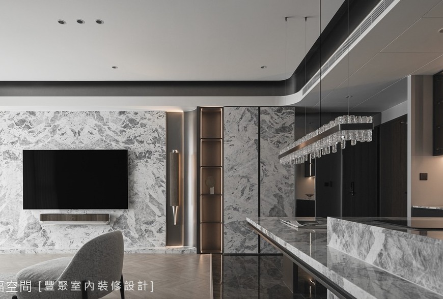 1.總監特別到石材廠,尋覓一個特別的奢石,從電視牆面、延續到玄關鞋櫃門、中島、餐桌,再到餐邊櫃的檯面與壁面,一致且延續的紋路,讓整體呈現訂製的奢華感。