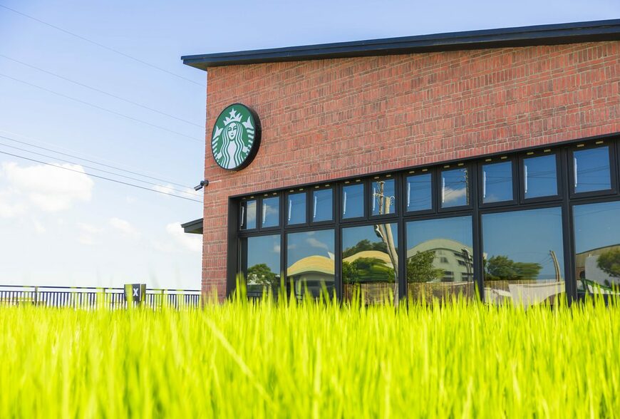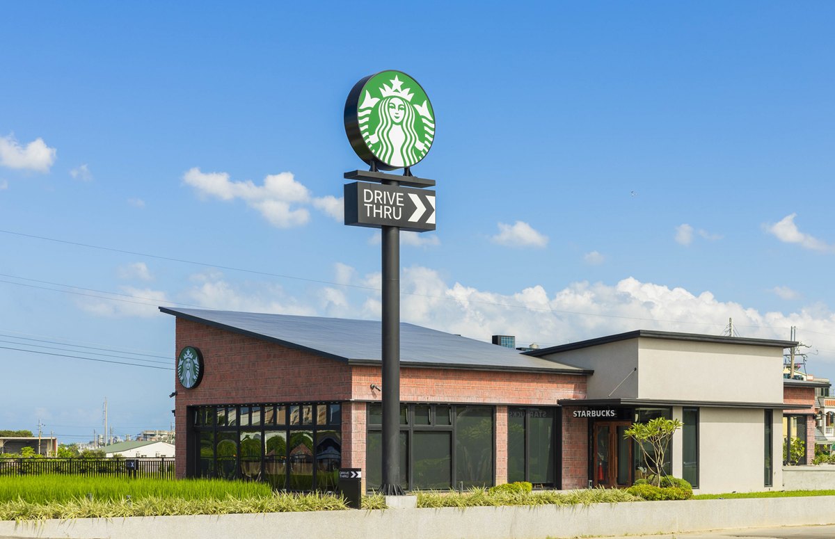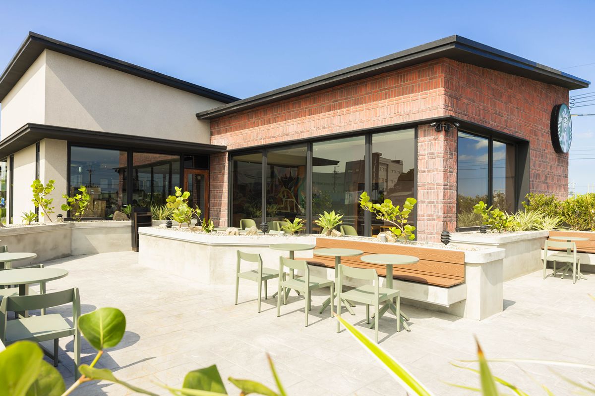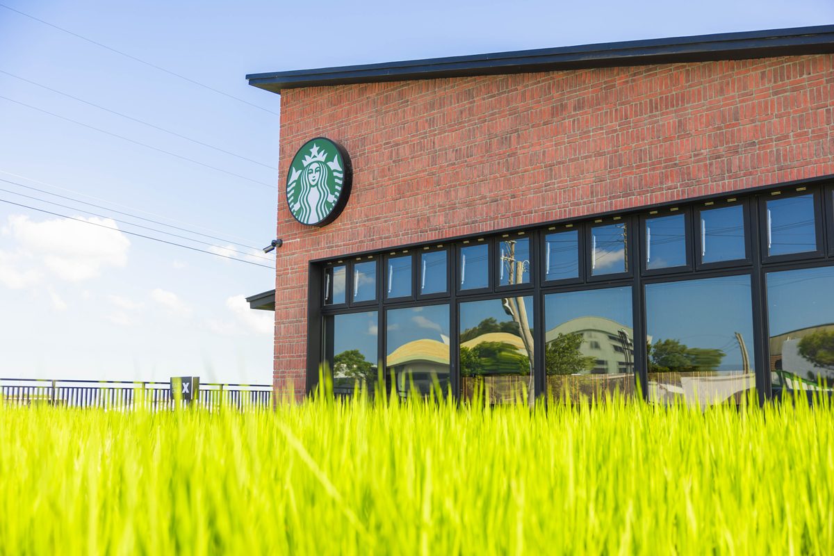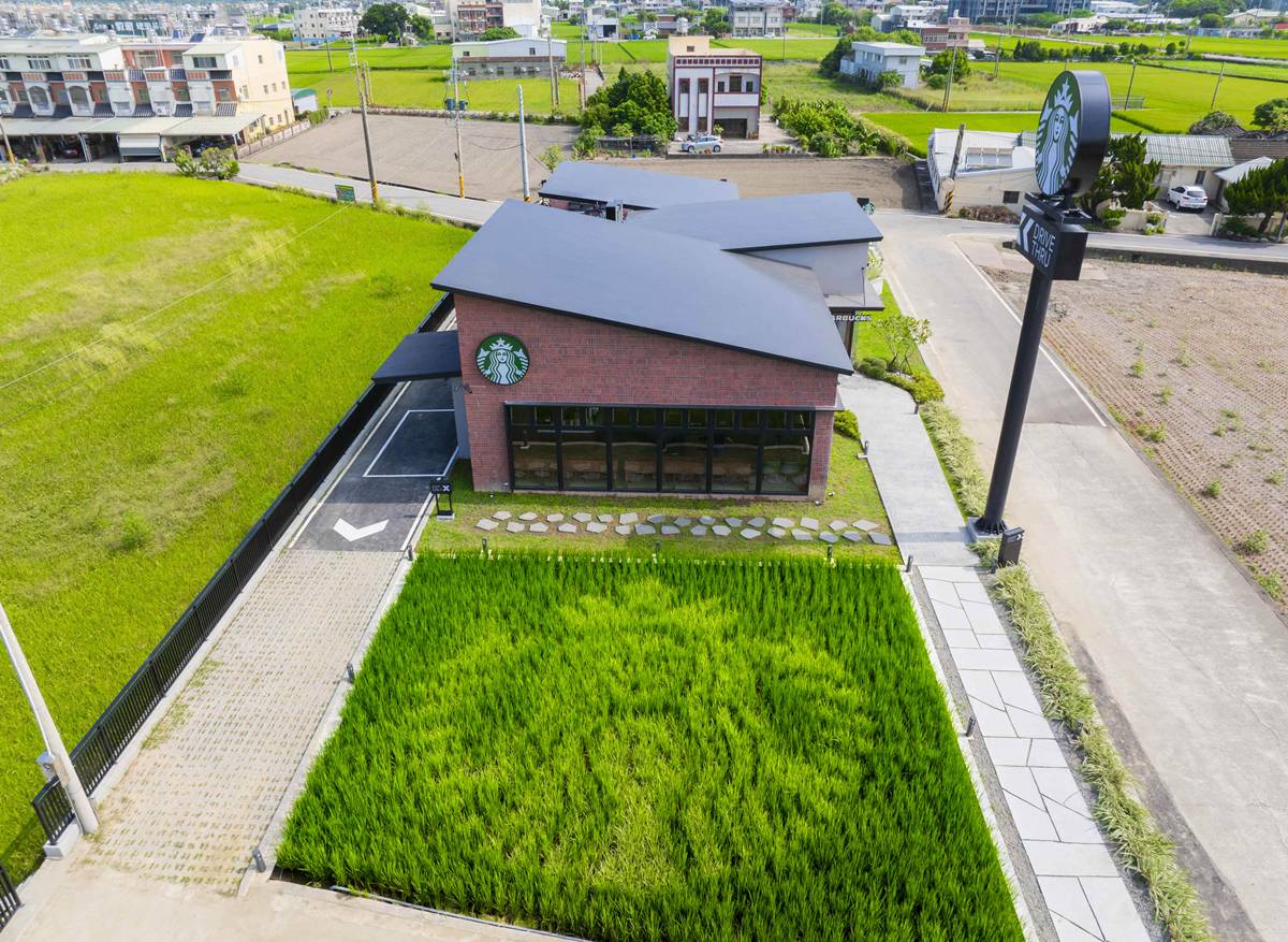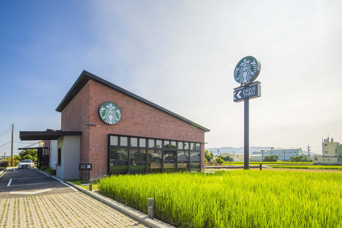 星巴克首度進駐苑裡,走進這片素有「苗栗穀倉」、「苗栗米倉」美譽的稻米之鄉,「苑裡稻香門市」於10月10日開幕,門市伴隨田野稻香而生,並設有車道型服務(Drive-Thru),不僅為在地生活注入全新咖啡風貌,帶來更便利、愜意的咖啡體驗。門市外觀採用磚紅色牆面結合仿舊設計,喚起農村記憶,並融入在地農業特色,打造具代表性的空間風貌,營造「與自然共處」的慢活咖啡氛圍。
