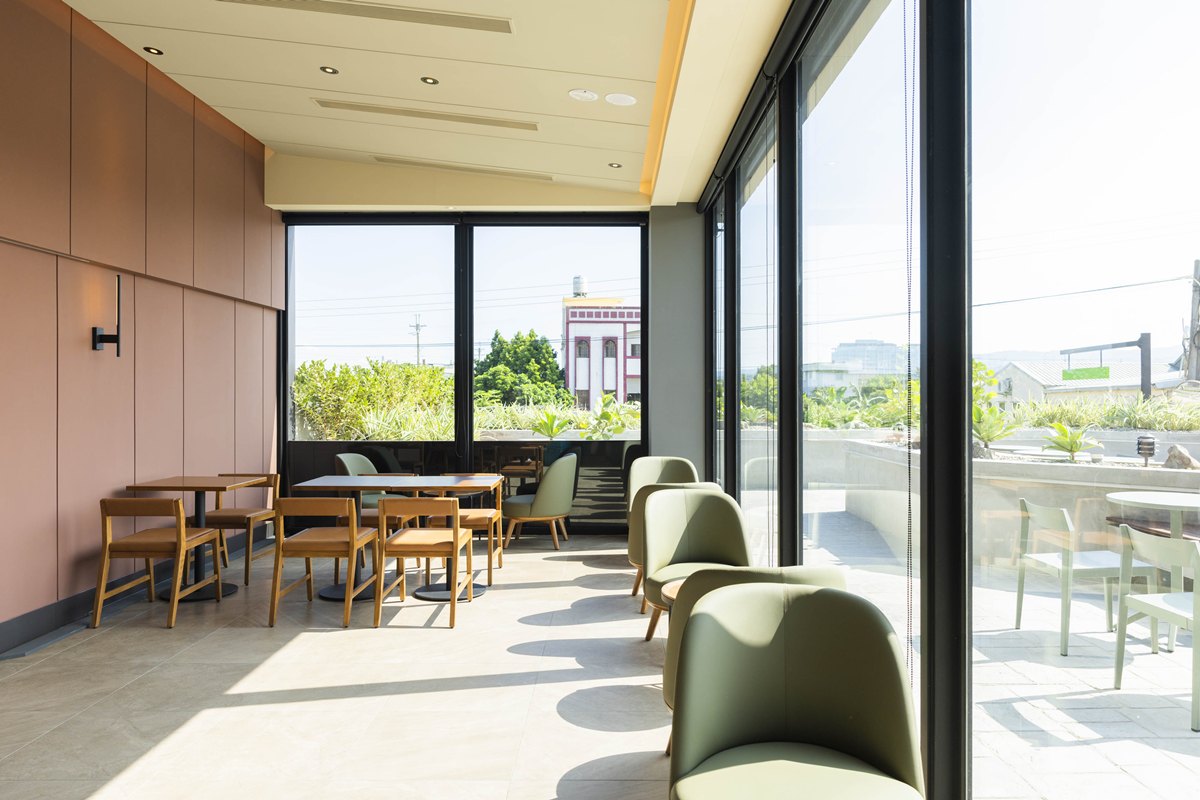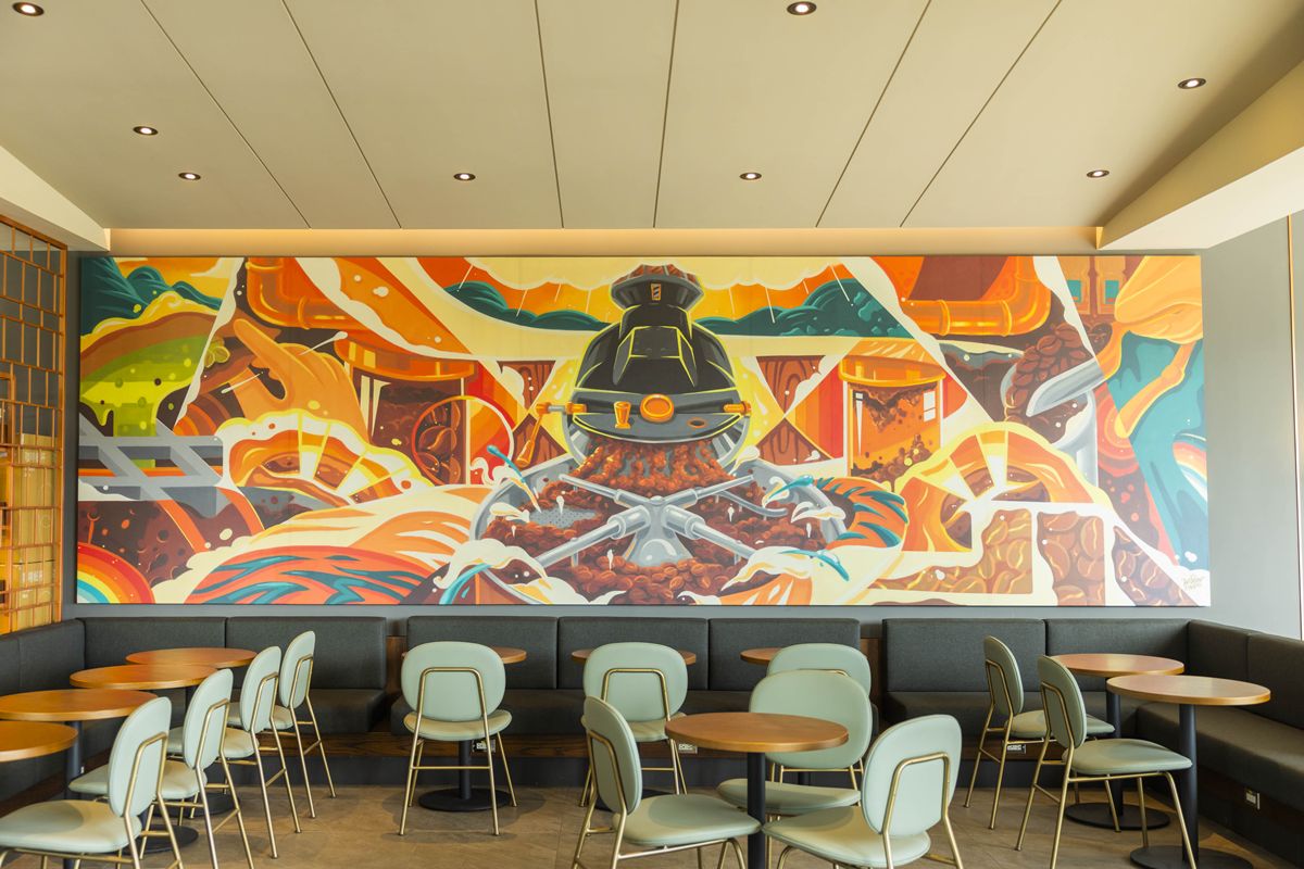 室內設計以稻田交錯縱橫為靈感,天花板線條宛如稻海延展,藝術牆面則以曬咖啡豆的畫面呼應稻米曬穀,展現咖啡與稻米同樣需經歷繁複工序,才能迎來豐收的意涵。將在地農業文化的底蘊融入日常咖啡時光,為苑裡注入嶄新的咖啡人文風景。