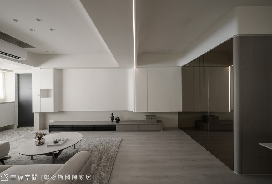 客廳電視牆大面留白,佐以簡約雕塑擺飾,無聲中映出藝術氣息。懸浮式櫃體與曲面造型轉角,削弱稜角、柔化視覺,是整體空間的設計亮點。