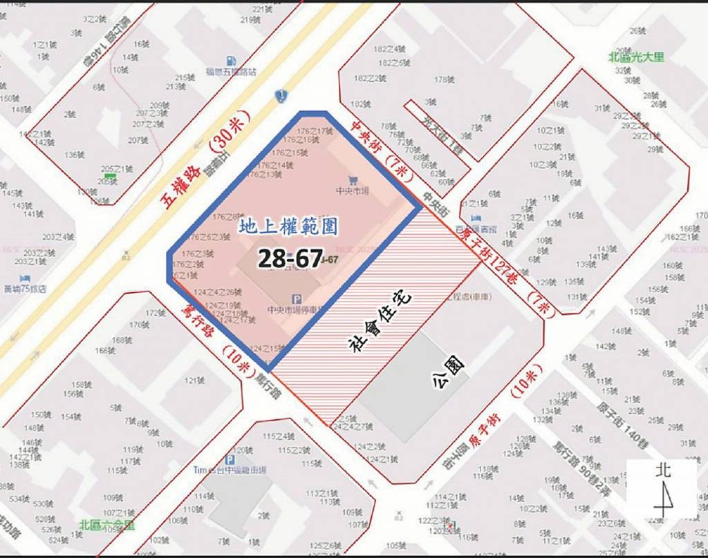 中央市場作為台中的心臟地帶,此次改造計畫被命名為「菜奇鴉園區」,由建設局、住宅處及財政局三大機關聯手推動。計畫將打造包含「公園綠地」、「社會住宅」及「商業空間」的多功能複合式場域,展現市府對舊市區整體再開發的決心。這塊位於北區文正段28~67地號的土地屬於第二種商業區,臨30米五權路,地形方整且三面臨路,交通便利性極佳。區位條件優越,具備發展複合型商場或生活型商場的市場潛力。既有建物拆除後,商業區土地面積達5,130平方公尺,將由財政局負責招商引資。