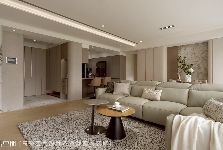 客廳與廚房採開放整合,透過材質選擇、光影層次與色彩語彙,打造兼具機能與美感的現代居家場域。設計不僅滿足生活需求,更展現空間的情感溫度與品味深度。