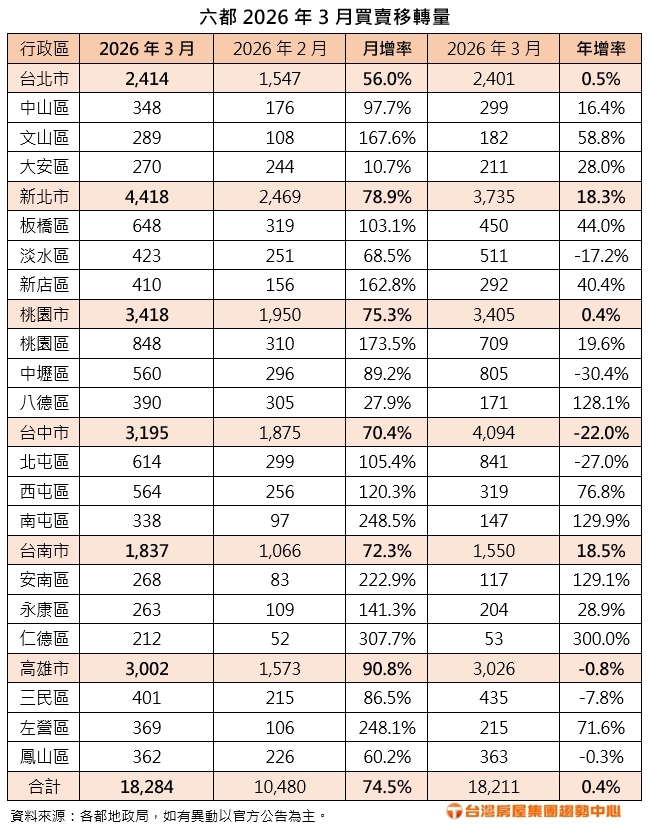六都今年3月的買賣移轉棟數已揭曉,分別為台北2414棟,月增56%,年增0.5%;新北4418棟,月增78.9%、年增18.3%;桃園3418棟,月增75.3%,年增0.4%;台中3195棟,月增70.4%,年減22%;台南1837棟,月增72.3%,年增18.5%;高雄3002棟,月增90.8%,年減0.8%;總計六都共18284棟,月增74.5%,年增0.4%。
