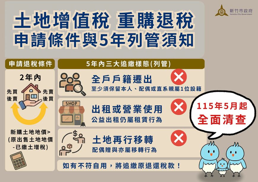 新竹市稅務局宣布,今年5月起全面清查「重購自用住宅用地退還土地增值稅」的核准案件。M編直接翻譯:你換屋時申請退回的那筆土增稅,政府會盯著你整整5年,期間只要你做了不該做的事,錢就要吐回去。