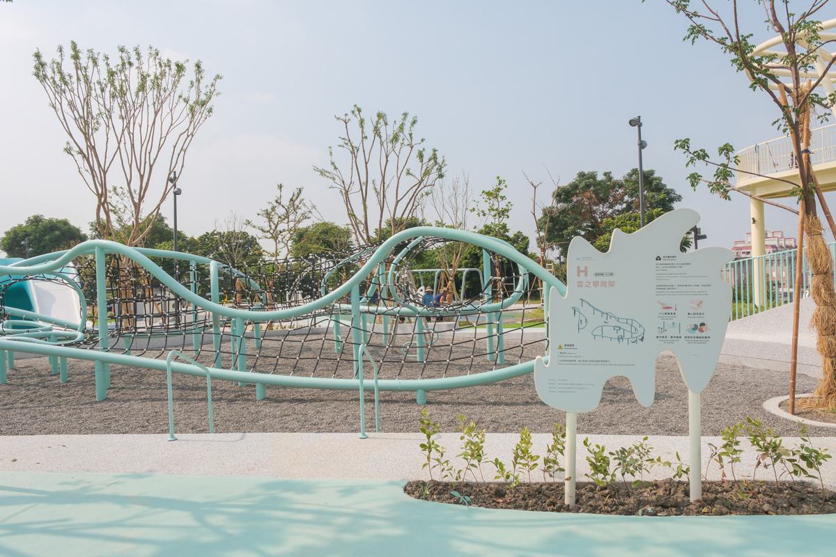 階曲設計 JHStudio 取材自八卦山獨特的地形地貌,將原有高低差轉化為空間語彙,打造如梯田般的層次。園區內的「雲之攀爬架」、「飄浮繩網」與「雲之溜滑梯」以藝術化造型呈現,使遊具兼具功能與觀賞性,也成為具互動性的公共藝術。