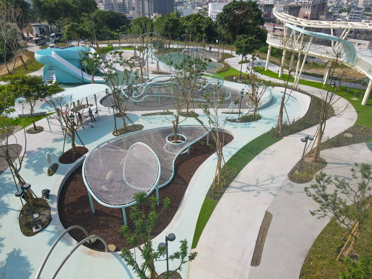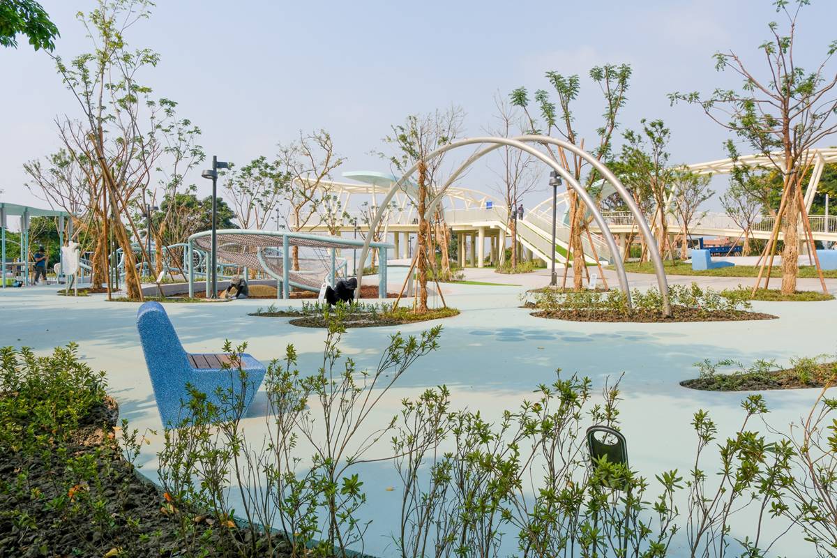 公園強調「共融」精神,設有無障礙路徑與多元尺度遊具,讓長者、孩童及行動不便者都能共享同一片遊戲天地。搭配原生植栽與自然遮蔭,公園隨四季展現不同風貌,成為融合遊戲、學習與自然體驗的綠色教室。