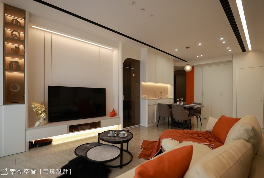 位於桃園的本案,以現代輕奢語彙詮釋居家美學的優雅節奏。公領域以橘色為主調,搭配米色膚感美耐板堆疊出溫柔又對比強烈的質感。玄關進門右側規劃整體收納櫃體,左側開放格設計搭配層架,兼顧收納與展示功能,讓日常更顯從容有序。為化解開門見灶的風水疑慮,設計師以弧形玻璃與雙面櫃體作為廚房與餐廳之分界,明確空間設定並兼具視覺通透。