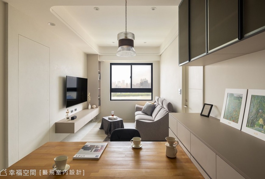 在動線與視覺重整上,巧妙美化了入口處的電箱牆面,並在有限的坪數內規劃出原先缺失的電器櫃空間。針對被切分的電視牆,則利用隱藏門技術將房間入口與牆面整合,延伸視覺面寬,打破小扇窗戶的侷限,將窗外遼闊的景致引入室內,讓這座高空宅邸成為機能與美學並行的舒壓居所。