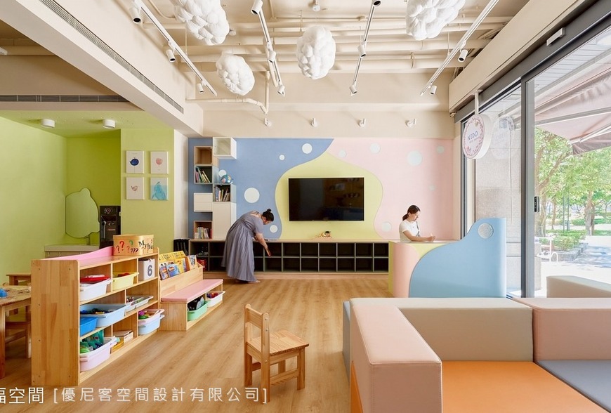 走上二樓,幾隻小鳥在公共區翱翔,彷彿引領著人們進入想像的國度。藍色教室沉入海底世界,波浪玻璃映照著悠遊的鯨魚;粉色教室則乘著熱氣球飛向天空,窗邊多彩氣球隨風搖曳。