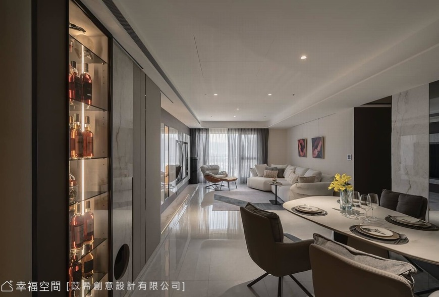 我們也特別重視公共區的實用性與美感結合。比如餐廳旁通透的玻璃酒櫃,它不僅是一個展示收藏的裝置,更成為客廳區域的藝術亮點。而玄關到內部的動線,透過不同材質交錯與曲面造型的引導,讓回家動線充滿儀式感。
