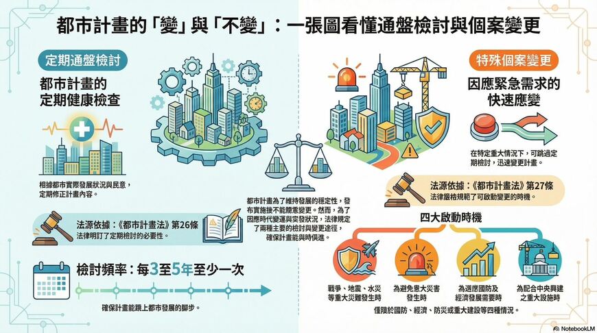 然而,城市的某些問題具有急迫性,無法等待數年一次的全面體檢才處理。例如,某個區域長期面臨淹水困擾亟需改善、社區缺乏公共活動空間需要新增,或因應重大公共工程建設必須調整特定土地的使用分區。