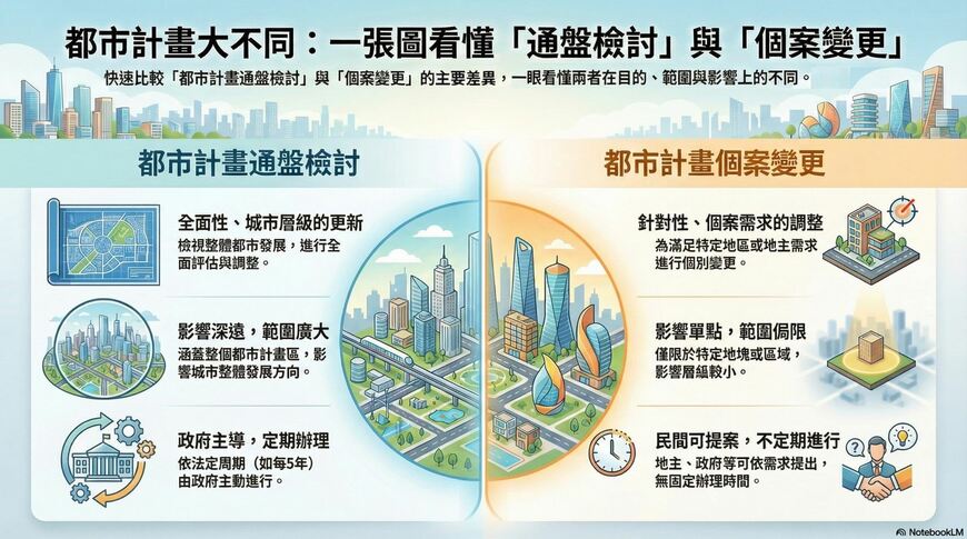 針對這類特定、局部的需求,就會啟動「個案變更」程序。它如同城市的「專科醫師」,針對特定「部位」進行更細緻、精準的微調,讓城市機能能更迅速地回應居民的切身需求。相較於通盤檢討的全面性,個案變更更著重於解決當前迫切的局部問題。