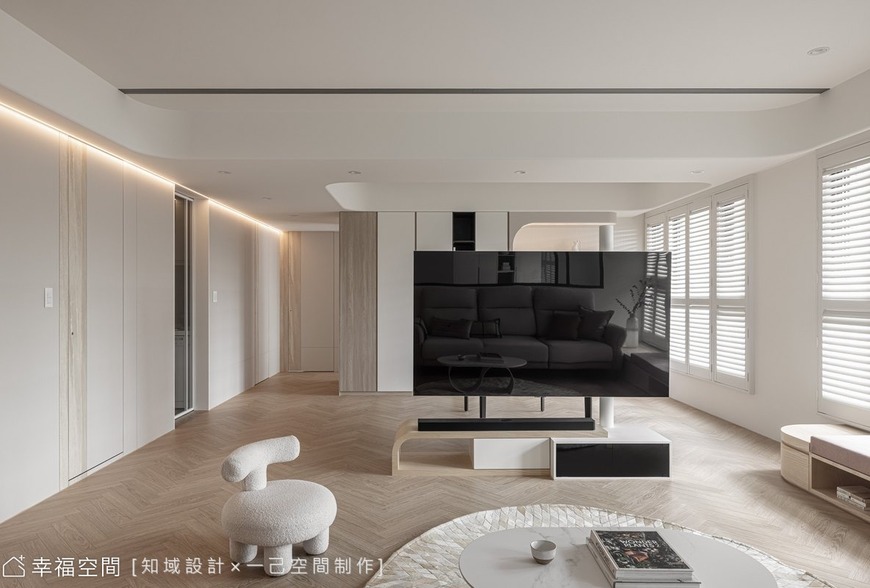 百葉導入的陽光,映照公領域的木質地坪。乾淨俐落的電視座界定客、餐廳空間,作為家人間互動的核心場所,予以加倍寬闊的遊戲動線;臥榻與收納合而為一,純白線板與窗景並排,如同置身異境的靜謐角落;餐廳則以木紋跳色層疊細節,簡潔之中藏著溫潤,櫃體融入磁吸機能,為餐邊日常增添便利性。