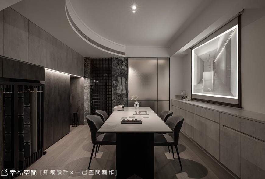 材質語彙交錯成詩,石紋、特殊塗料、鐵件與木質並置,剛柔並濟地堆疊出灰階深度。圓弧會議桌延展動線,搭配流線光帶收邊,讓視覺與思緒於此沉澱、轉折,終歸於靜。
