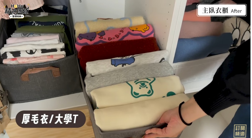 T-shirt、家居服等柔軟衣物,若以堆疊方式收納,容易在取用時造成整疊移位。改採用直立式收納,讓每件衣物都能獨立取出,可有效降低反覆整理的頻率。